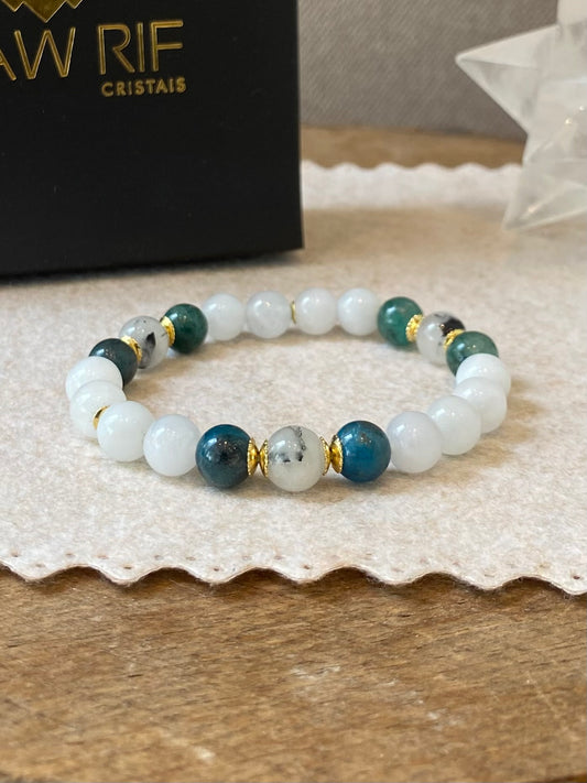 Água Marinha, Apatita Azul e Quartzo Turmalinado – Equilíbrio Emocional, Intuição e Limpeza Energética (Banho Ouro 18K) #ConjuntoCR