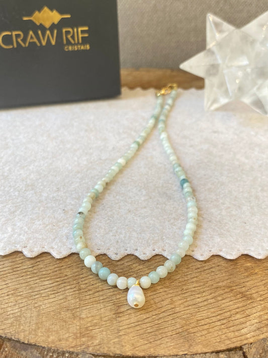 CR Choker | Colar Amazonita e Pérola – Calmaria, Bem-estar e Comunicação Leve (Banho Ouro 18K)
