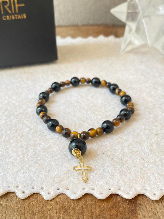 CR Terço de Mão | Olho de Tigre e Quartzo Turmalinado – Proteção, Positividade e Clareza (Banho Ouro 18K)