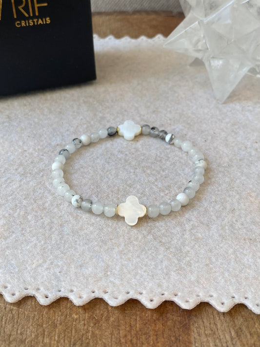 CR Lucky | Quartzo Turmalinado e Howlita com Trevos de Madrepérola – Paz, Calmaria e Energia Leve (Banho Ouro 18K)