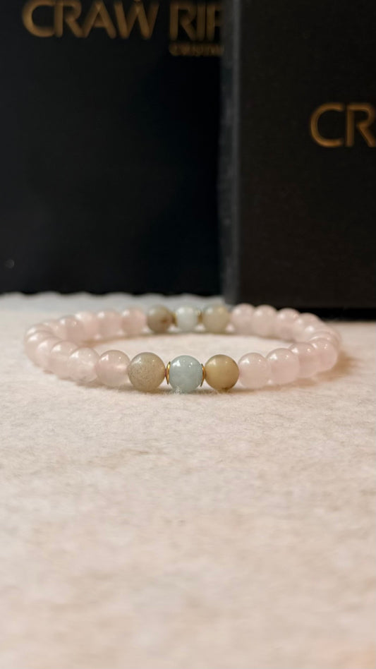 CR Uno | Quartzo Rosa, Água Marinha e Amazonita – Amor, Equilíbrio Emocional e Bem-estar (Banho Ouro 18K)