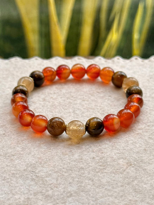 CR Tríade | Cornalina, Olho de Tigre e Quartzo Rutilado – Vitalidade, Proteção e Prosperidade (Banho Ouro 18K)