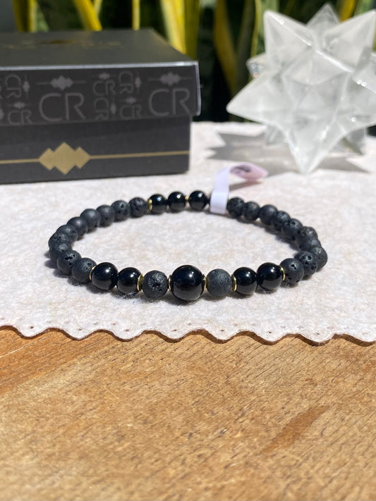 Lava Vulcânica, Quartzo Turmalinado e Turmalina Negra – Proteção, Clareza e Força Pessoal (Banho Ouro 18K) #AegisCR