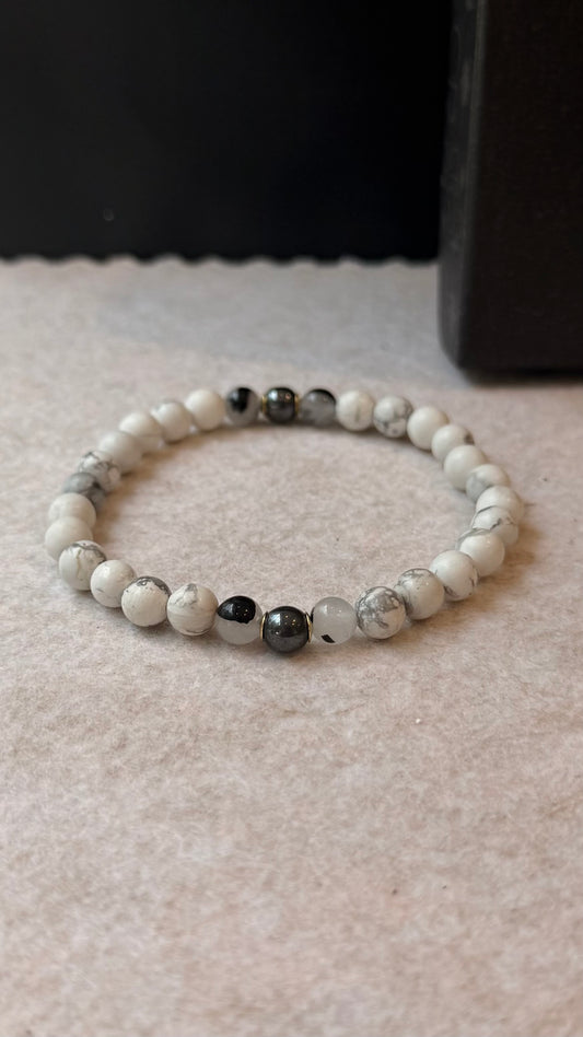 Howlita, Quartzo Turmalinado e Hematita – Paz, Clareza e Proteção (Banho Ouro 18K) #AegisCR