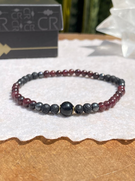 Pedra Granada, Hematita, Lava Vulcânica e Turmalina Negra – Prosperidade, Determinação e Proteção (Banho Ouro 18K) #MinimalistaCR