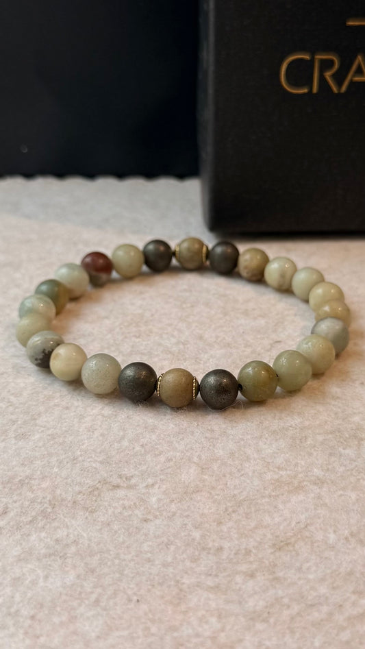 Amazonita, Pirita e Jaspe Madeira – Calmaria, Prosperidade e Estabilidade (Banho Ouro 18K) #AegisCR
