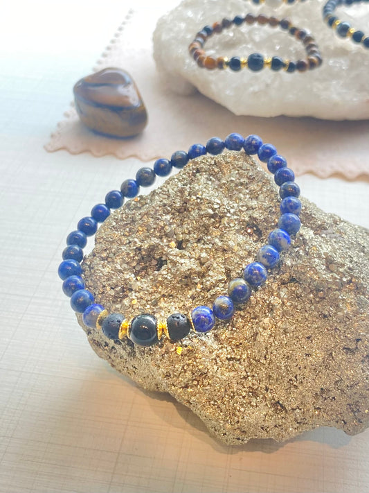 Lápis-Lazúli, Lava Vulcânica e Turmalina Negra – Espiritualidade, Sabedoria e Proteção (Banho Ouro 18K) #UnoCR