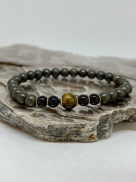 Pedra Granada, Pirita e Olho de Tigre – Determinação, Prosperidade e Proteção (Banho Ouro 18K) #UnoCR