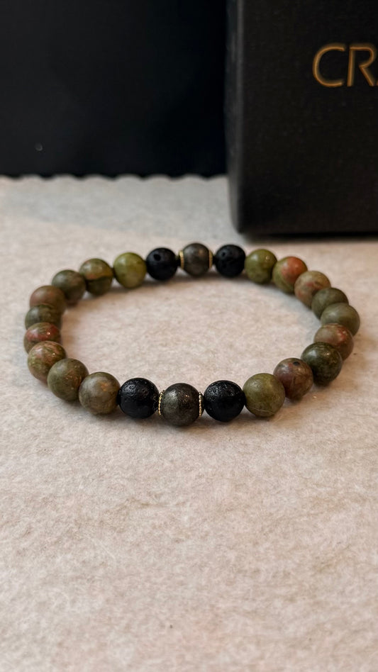 Unakita, Lava Vulcânica e Pirita – Autoconhecimento, Proteção e Prosperidade (Banho Ouro 18K) #AegisCR