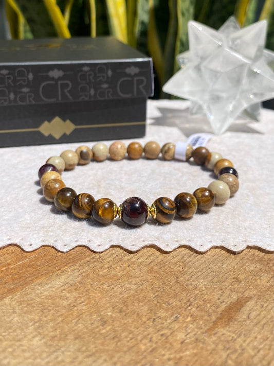 Jaspe Madeira, Olho de Tigre e Pedra Granada – Estabilidade, Proteção e Prosperidade (Banho Ouro 18K) #GoldenCR