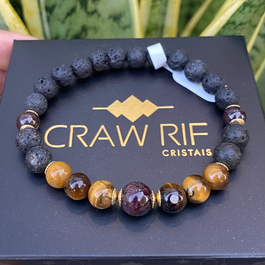 Lava Vulcânica, Olho de Tigre e Pedra Granada – Proteção, Prosperidade e Determinação (Banho Ouro 18K) #GoldenCR