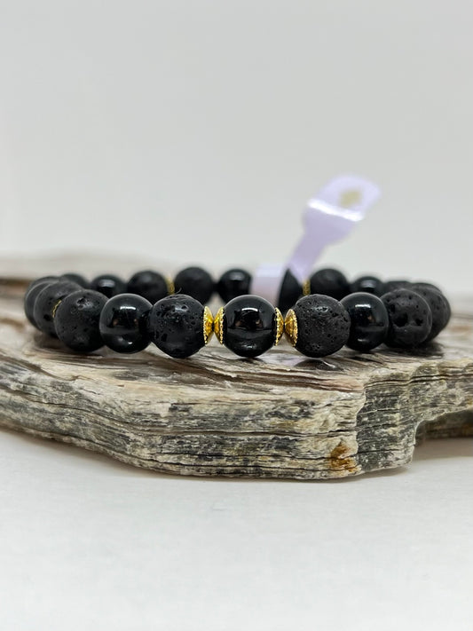 Lava Vulcânica, Turmalina Negra e Hematita – Proteção, AntiStress e Força Pessoal (Banho Ouro 18K) #GoldenCR