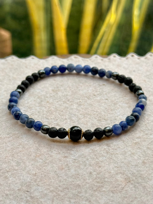 CR Line | Sodalita, Hematita, Lava Vulcânica e Turmalina Negra – Foco, Intuição e Proteção (Banho Ouro 18K)