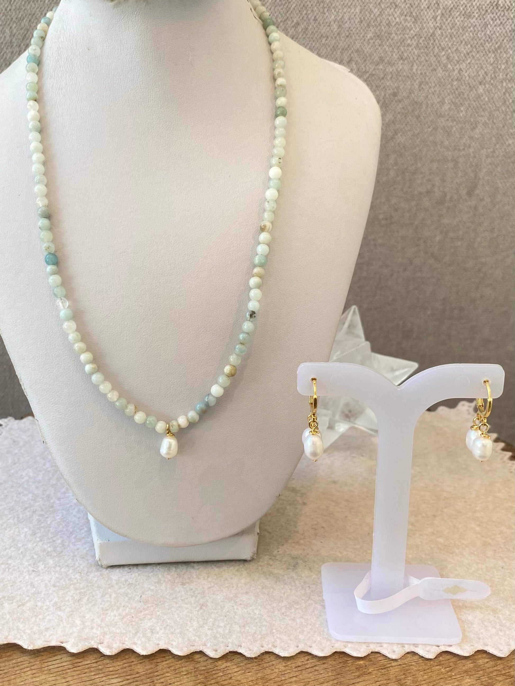 Conjunto Colar + Brinco feito a mão com cristais de Amazonita e Pérola.
