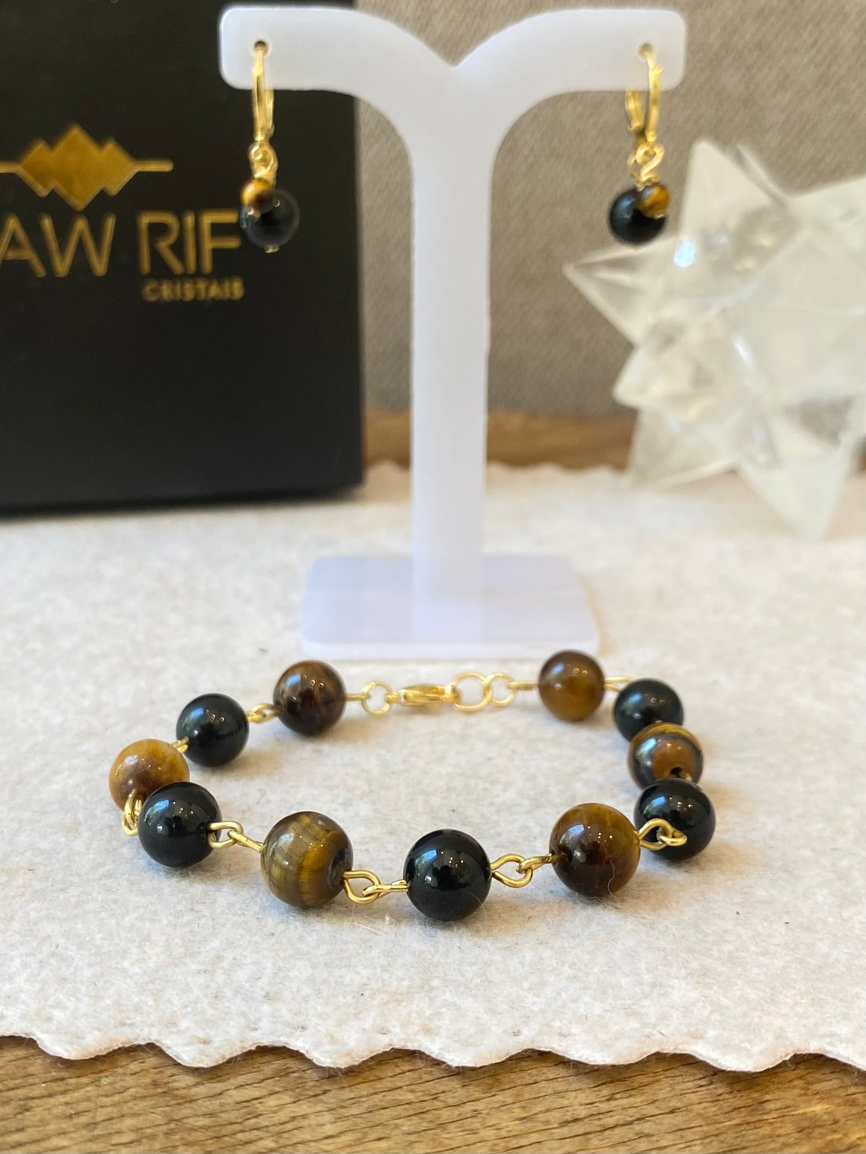 Conjunto Pulseira e Brinco Craw Rif feita a mão com cristais de Olho de Tigre e Turmalina Negra e detalhes banhados a Ouro 18K