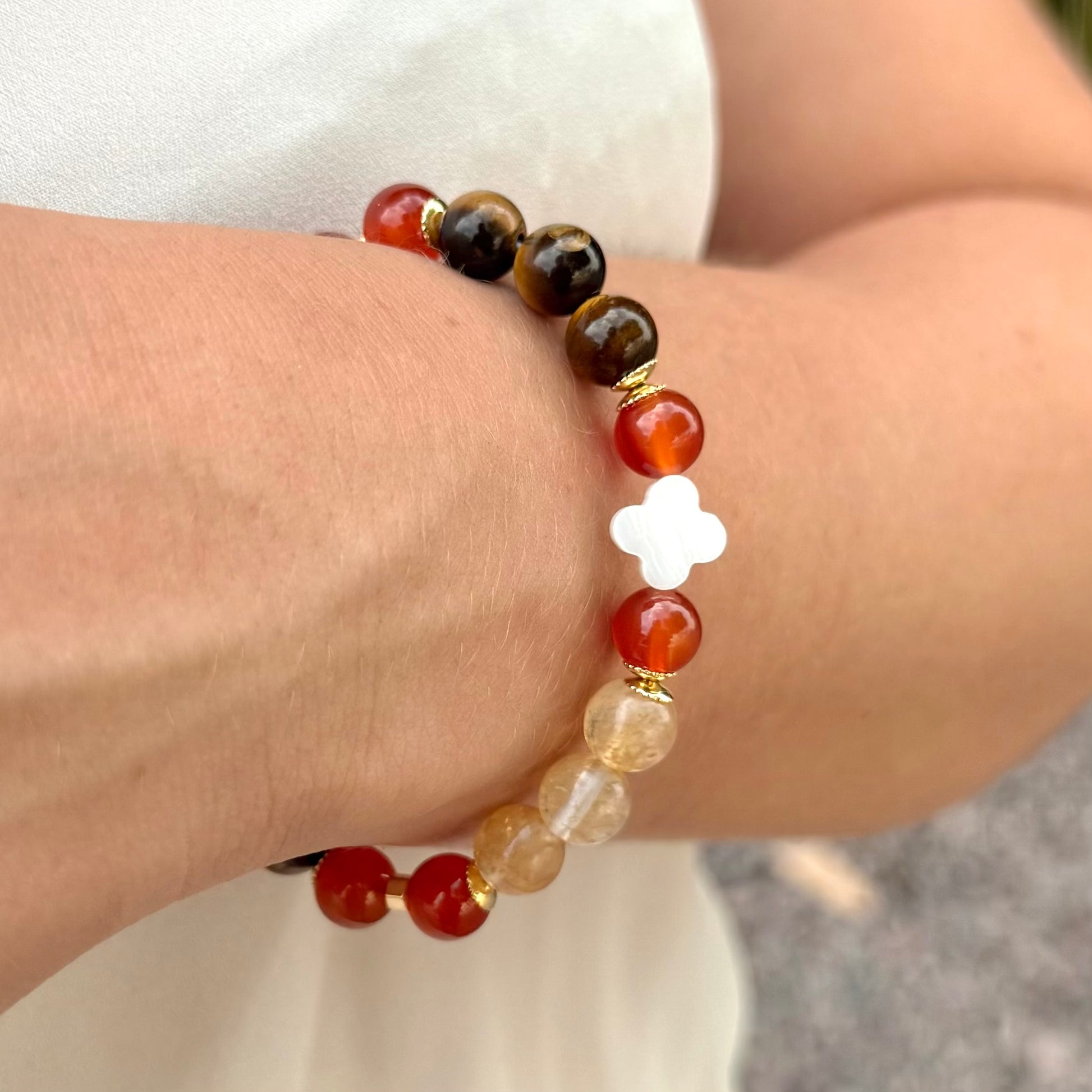 Joia CR feita a mão com cristais de Cornalina, Olho de Tigre e Quartzo Rutilado. Trevo de Madrepérola.