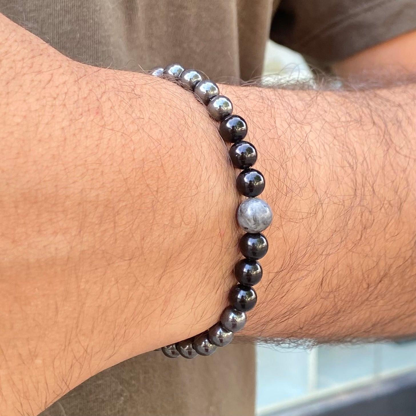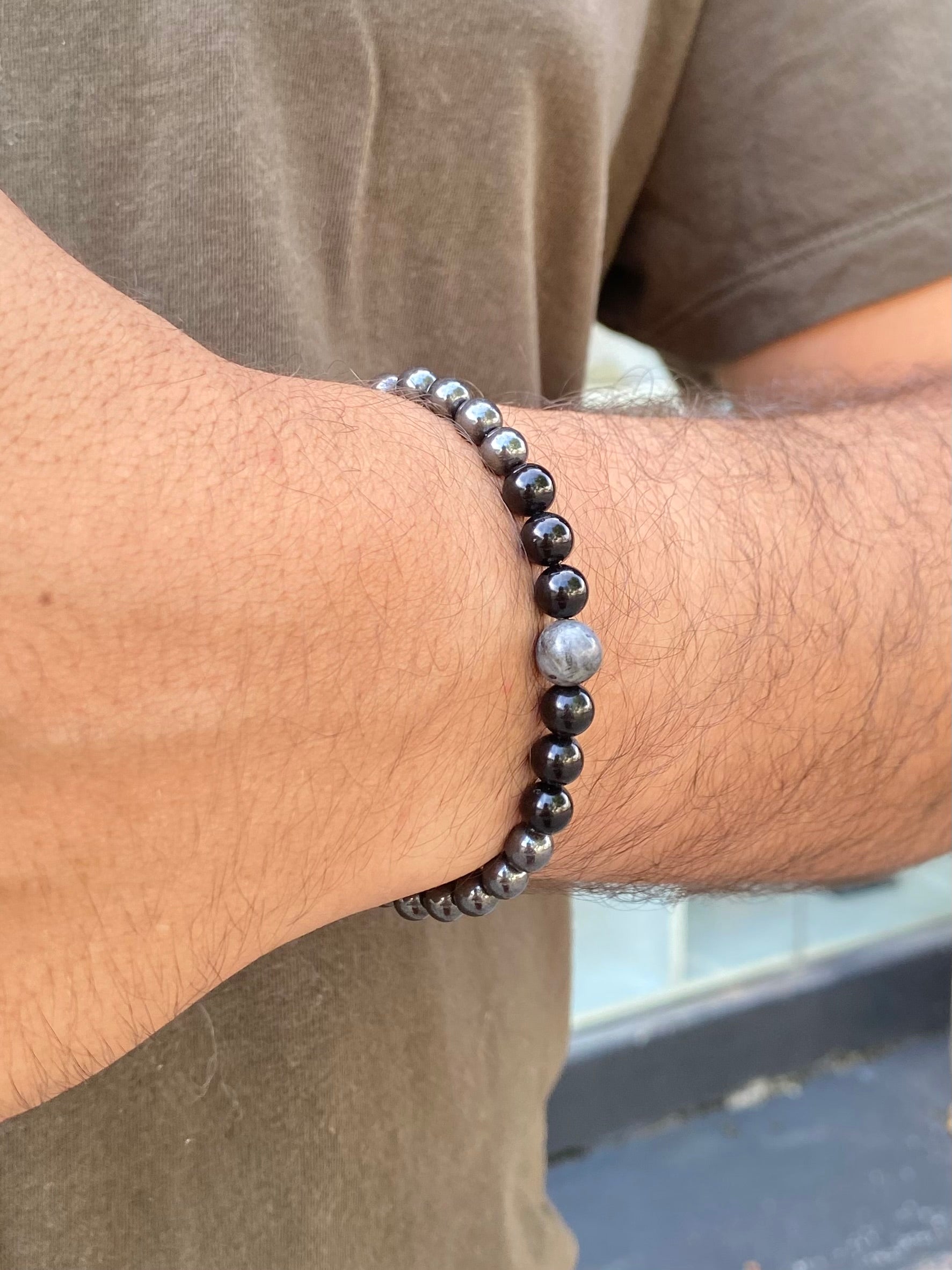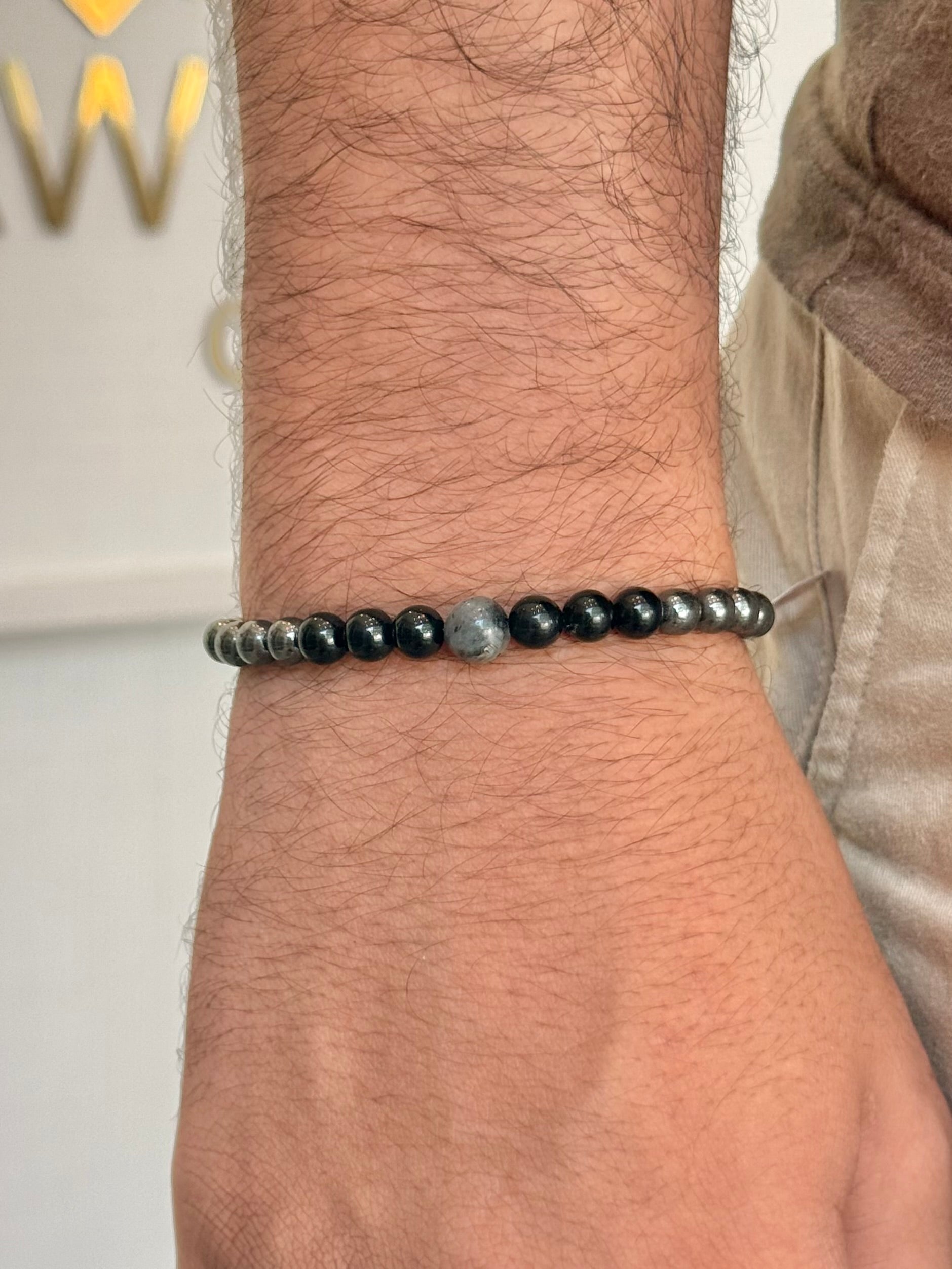 Feita à mão com cristais de Labradorita, Turmalina Negra e Hematita.