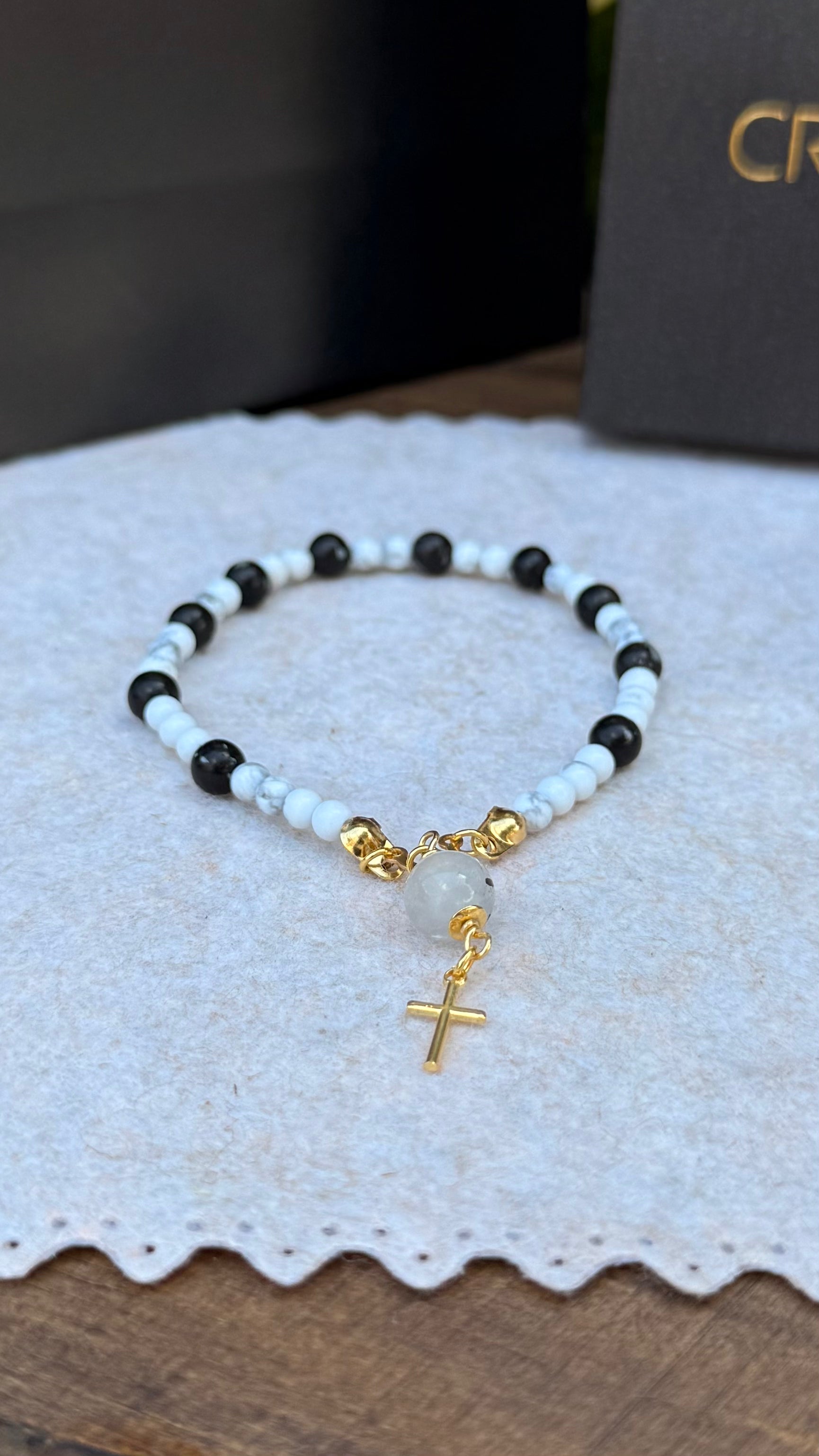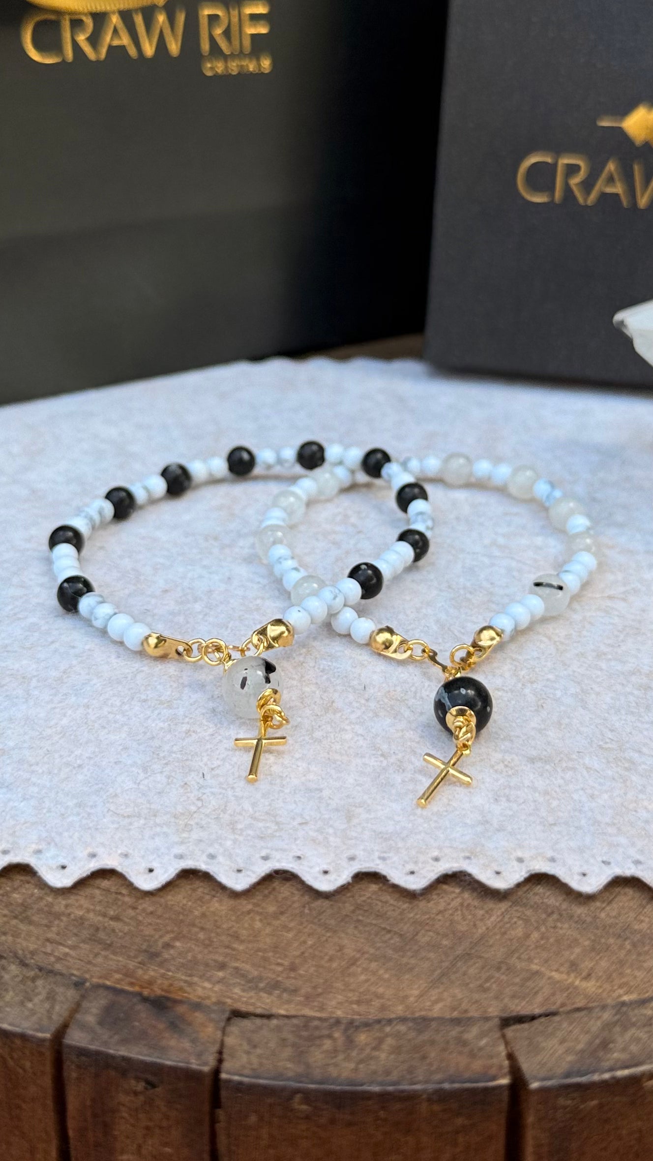 CR Casal | Terço de Mão Howlita, Quartzo Turmalinado e Obsidiana Flocos de Neve – Paz, Limpeza e Proteção (Banho Ouro 18K)