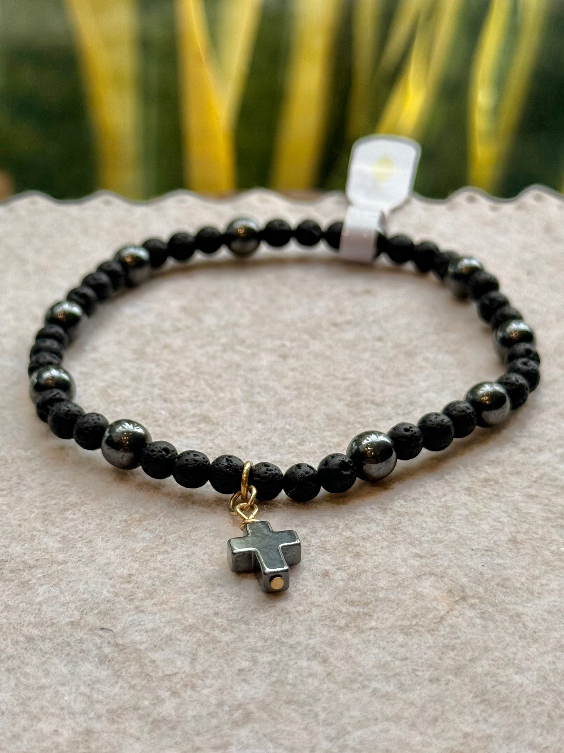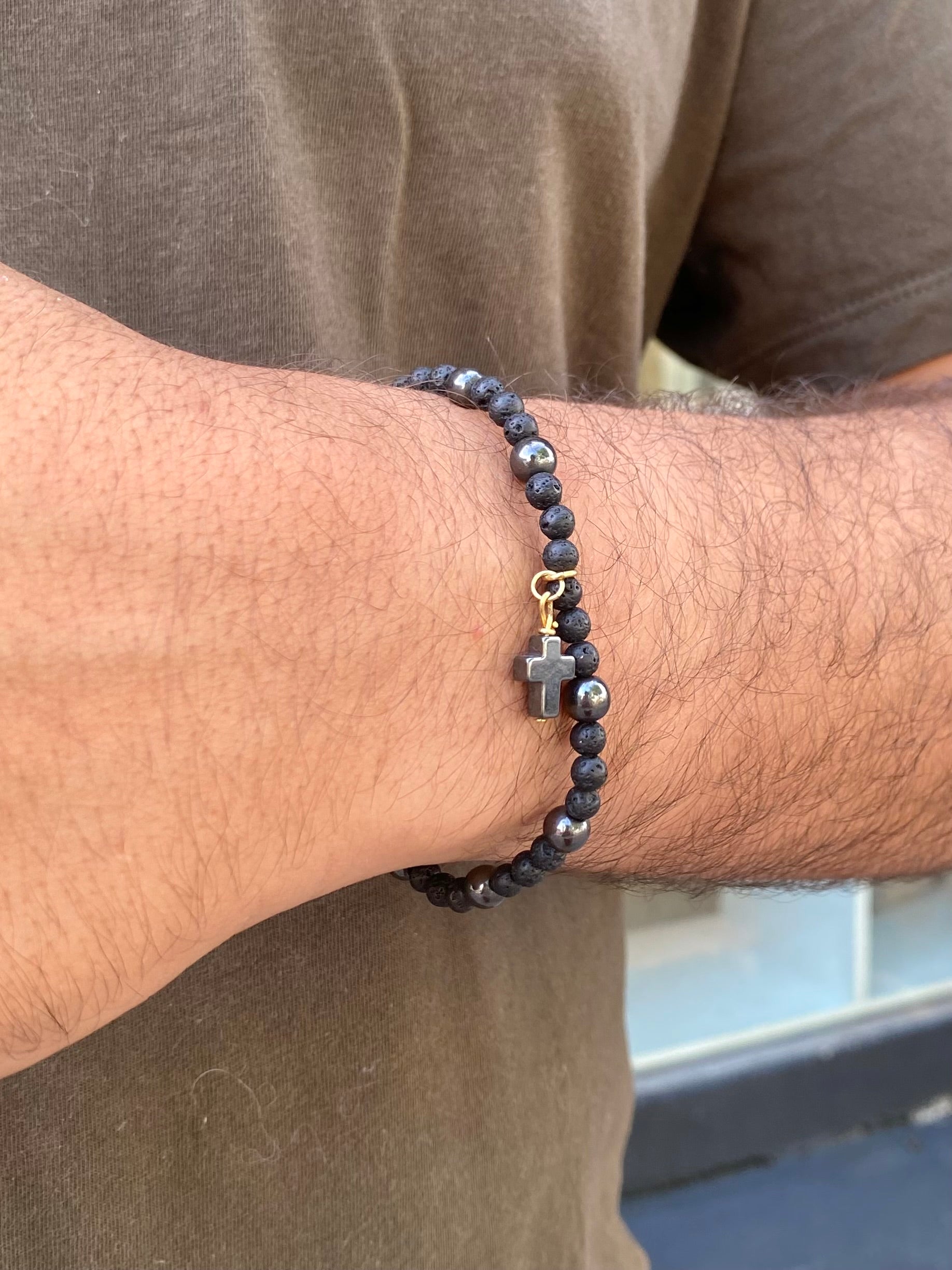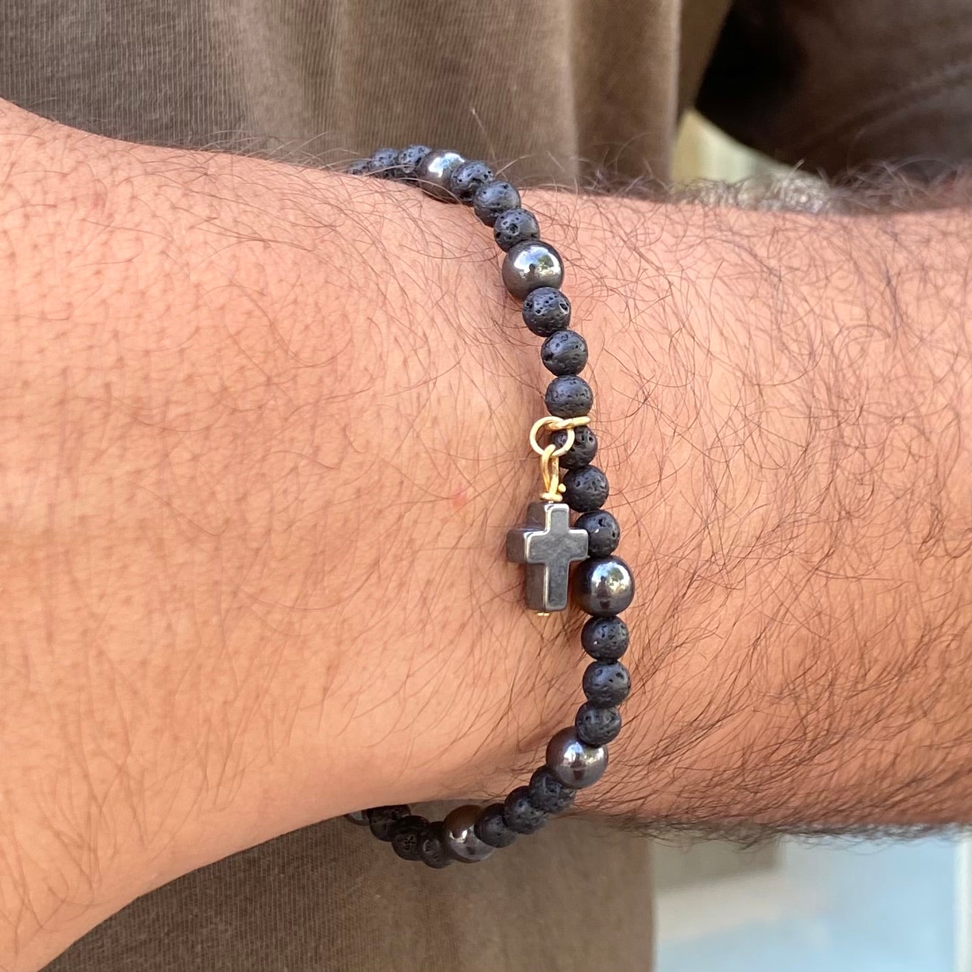 Feita à mão com cristais de Lava Vulcânica e Hematita.
