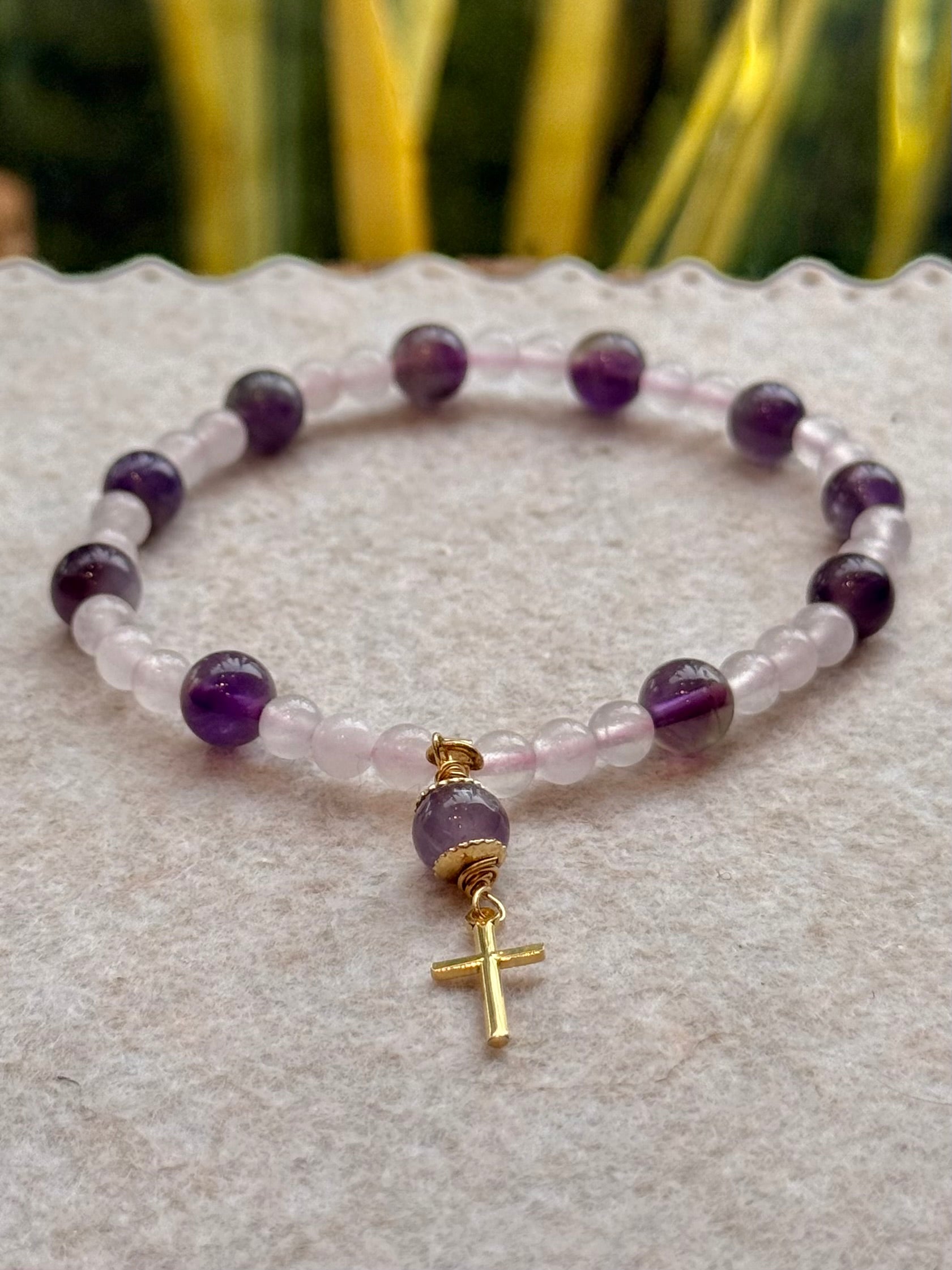 CR Terço de Mão | Quartzo Rosa e Ametista – Paz, Amor e Espiritualidade (Banho Ouro 18K)