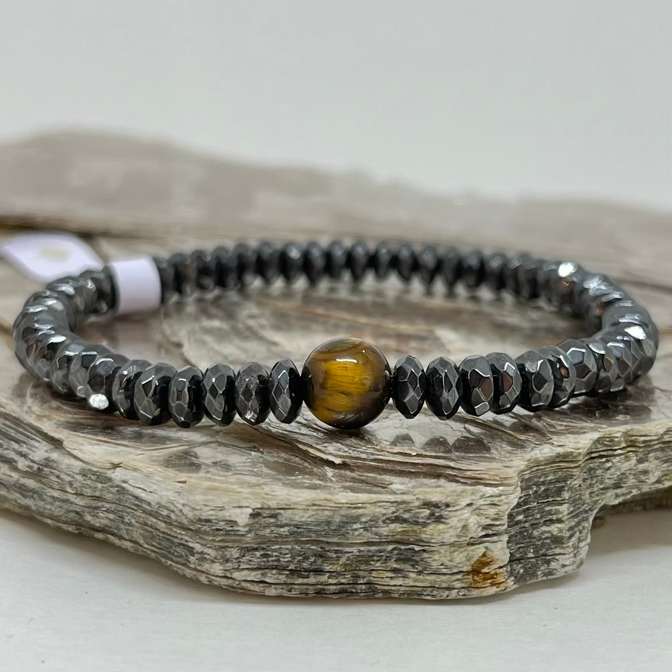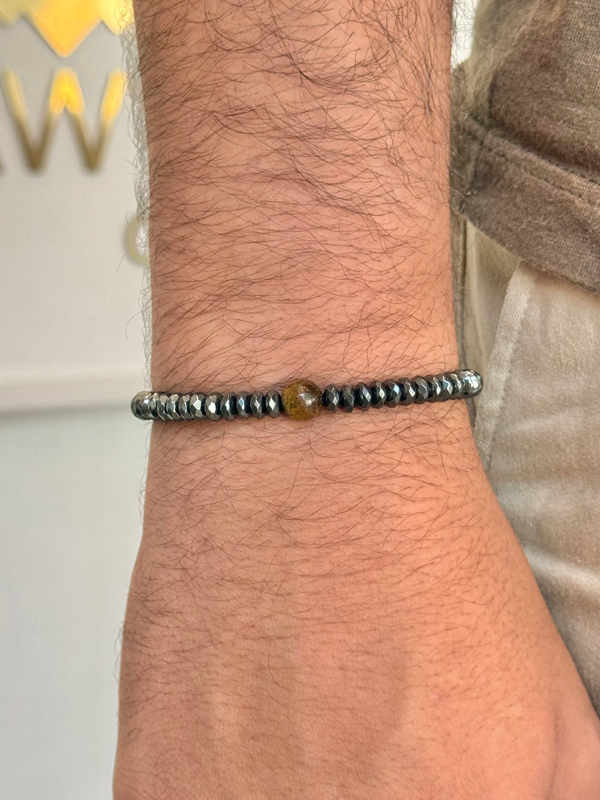 Joia Craw Rif, feita à mão, com discos de Pedra Hematita Lapidada com pedra Olho de Tigre no meio.