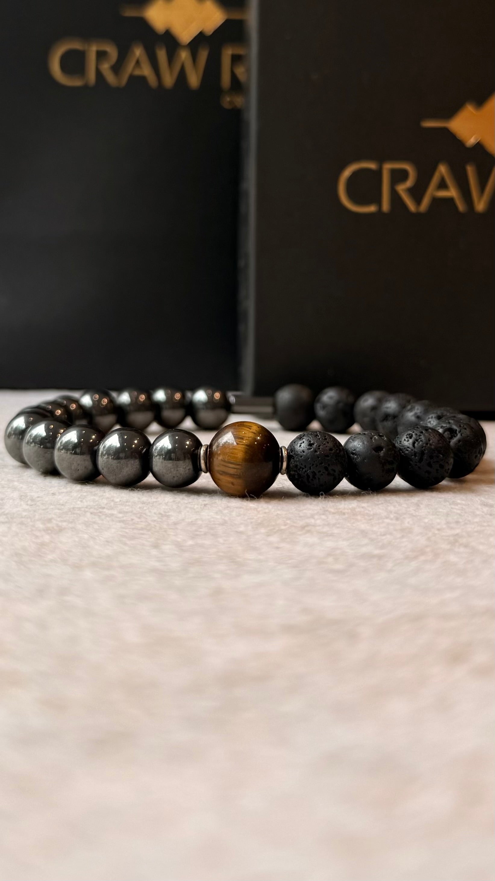 Feito mão com cristais de Hematita, Lava Vulcânica e Olho de Tigre.