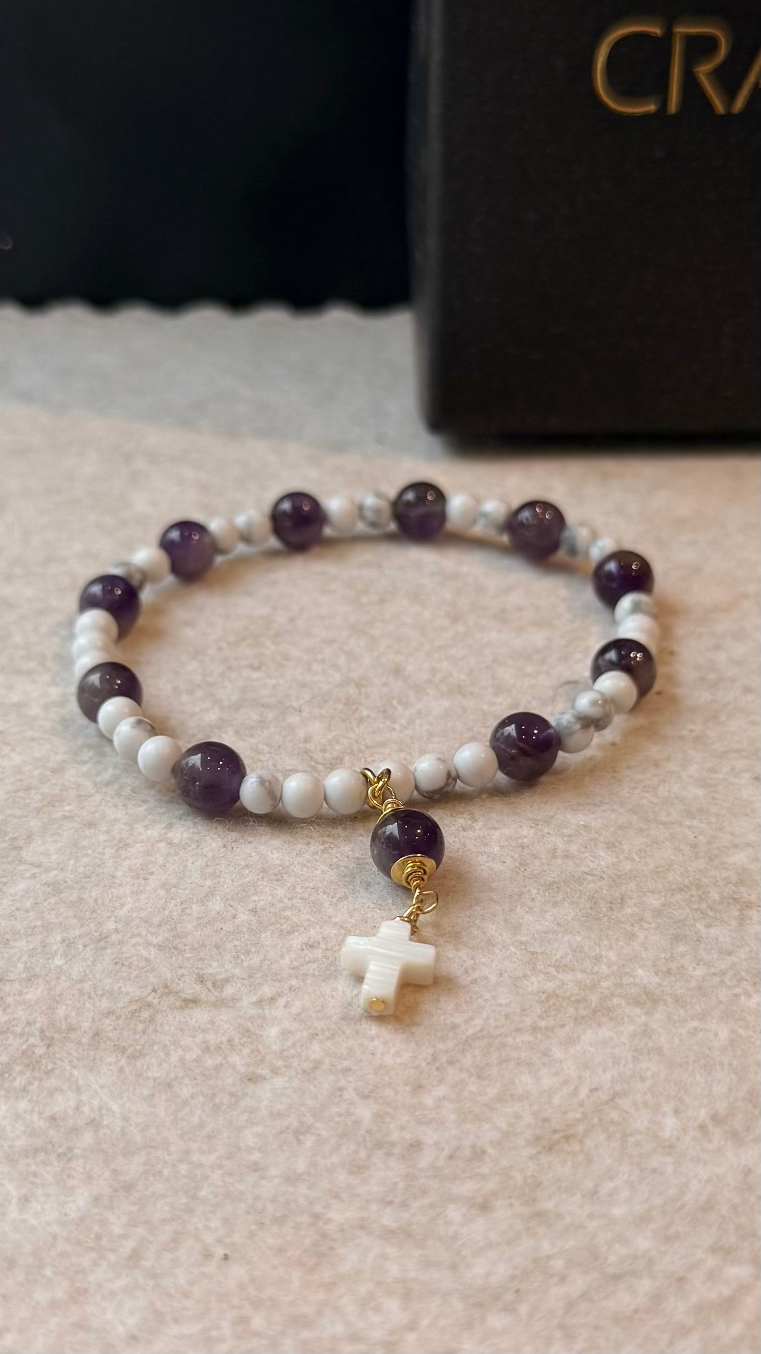Joia Craw Rif, feita à mão, com cristais Howlita e Ametista. Cruz de Madrepérola.
