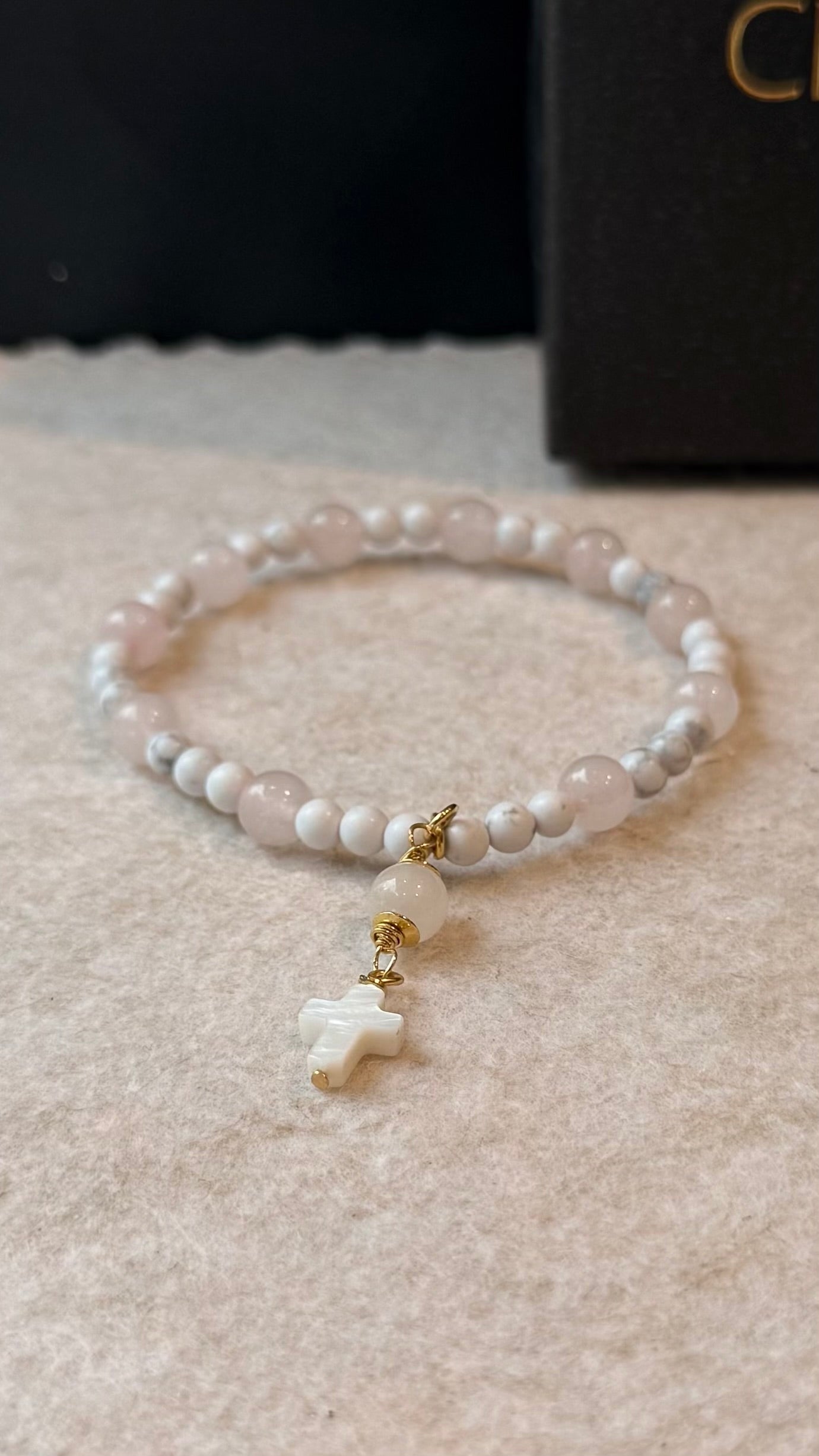 Joia Craw Rif, feita à mão, com cristais Howlita e Quartzo Rosa. Cruz de Madrepérola.