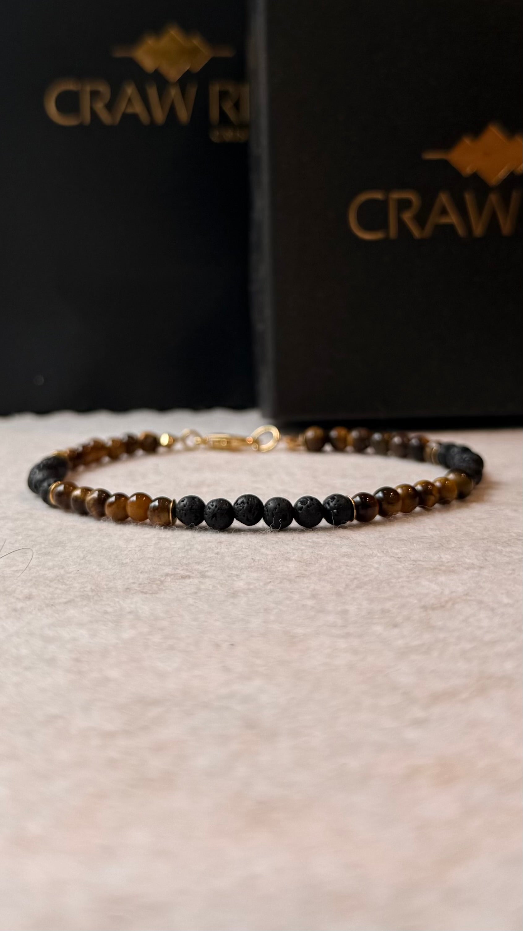 Tornozeleira Craw Rif, feita à mão, com cristais de Olho de Tigre e Lava Vulcânica. Detalhes banhados a Ouro 18K