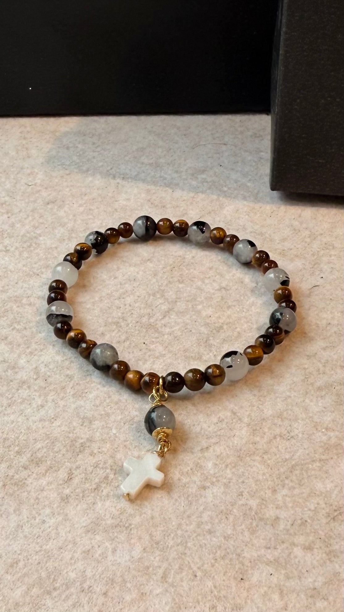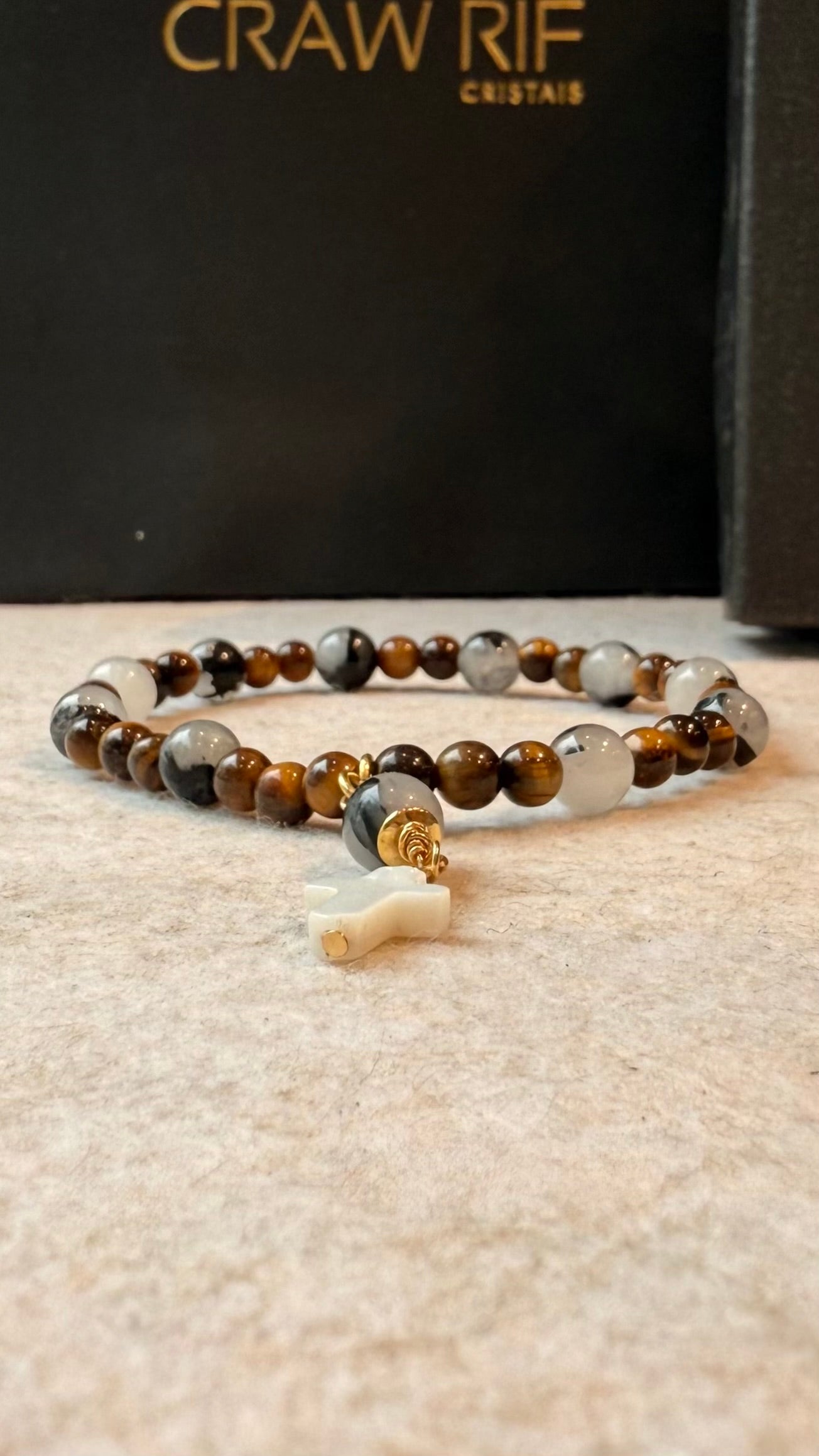 Pulexita Terço de Mão Craw Rif feita a mão com cristais de Olho de Tigre e Quartzo Turmalinado e detalhes banhados a Ouro 18K