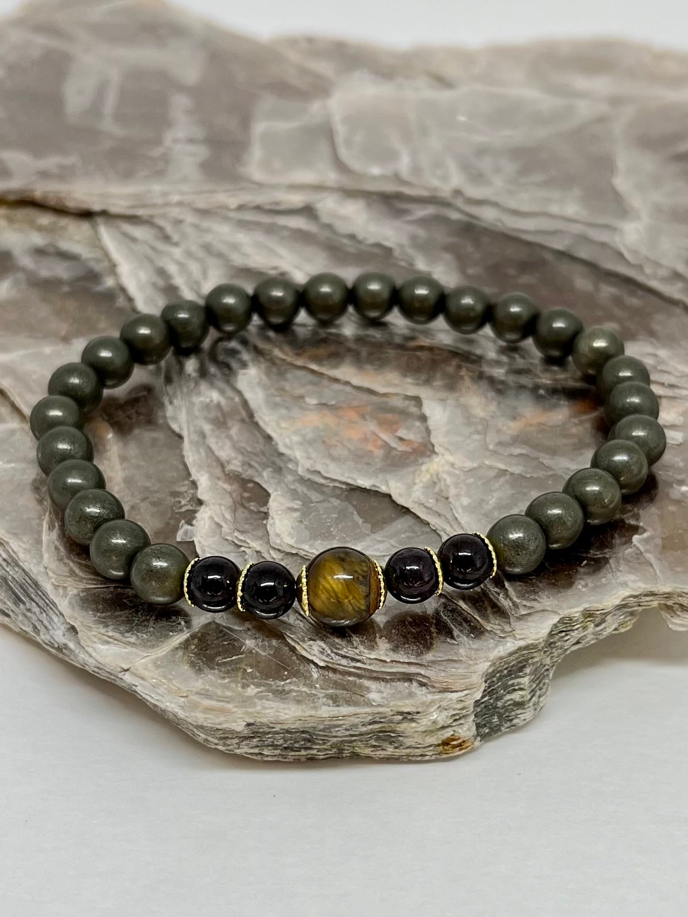 Joia Craw Rif feita a mão com cristais de Pirita, Pedra Granada e Olho de Tigre.