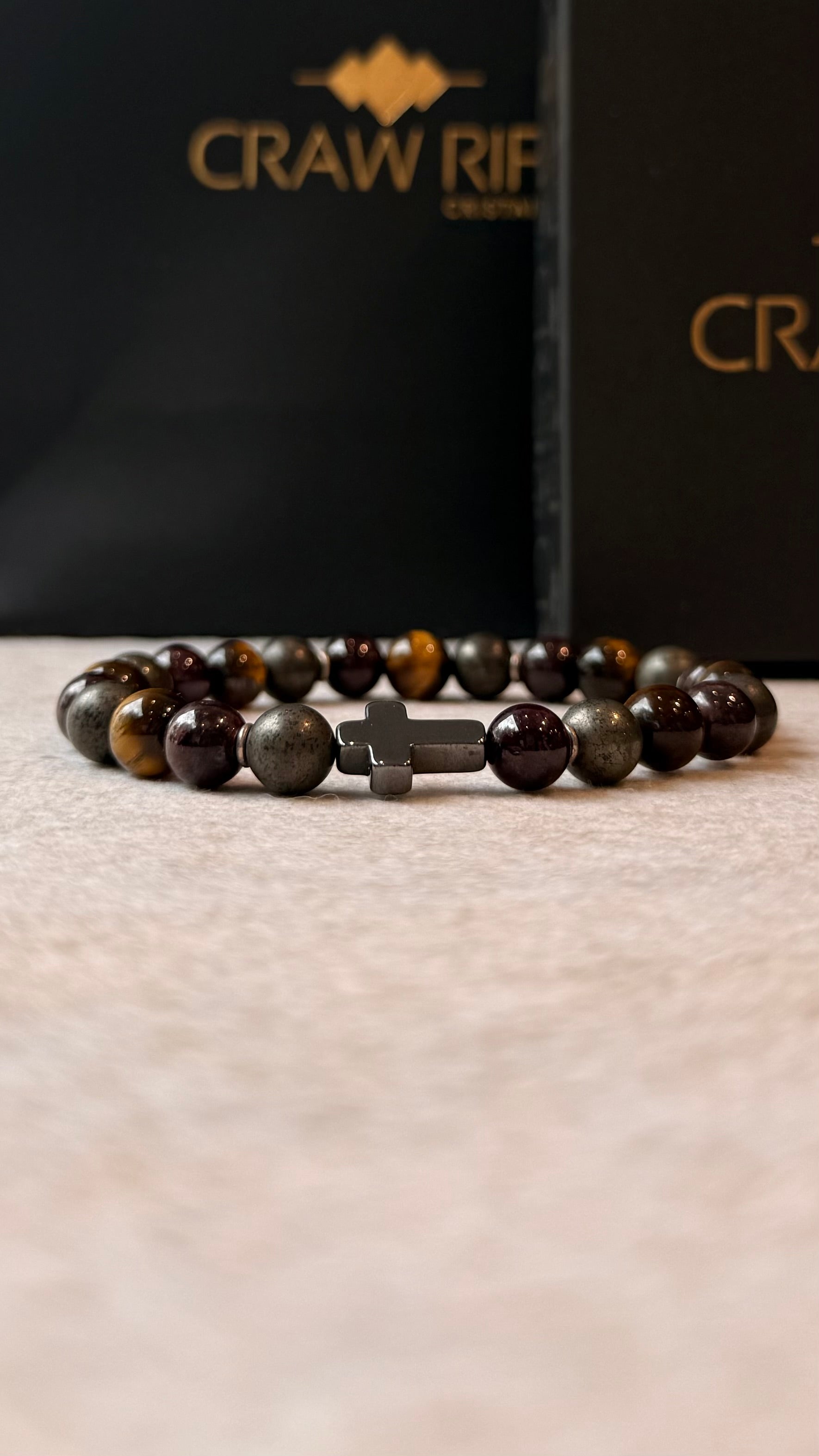 Feito mão com cristais de Pirita, Olho de Tigre e Granada com cruz de Hematita.