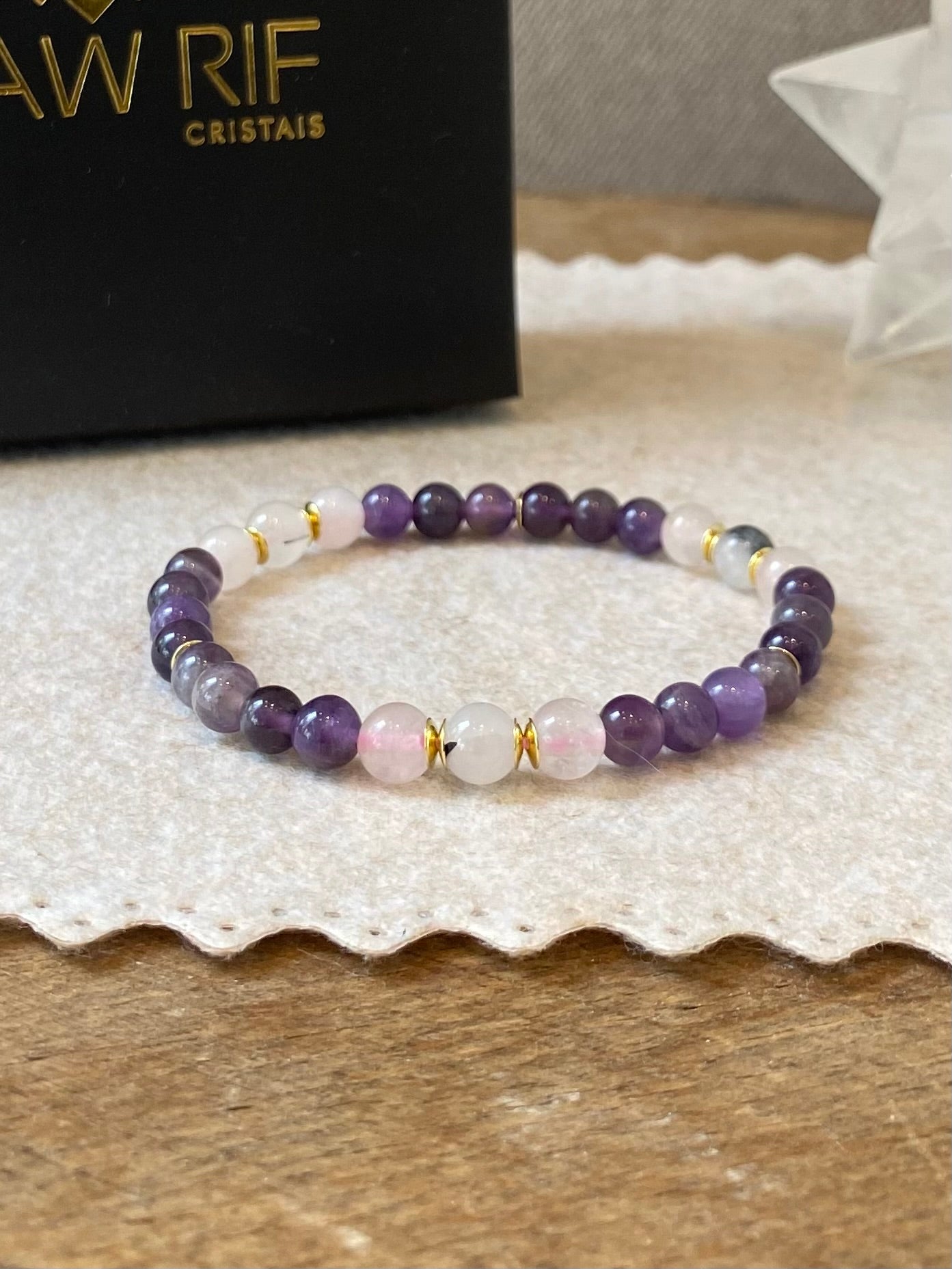 Joia CR feita a mão com cristais de Ametista, Quartzo Rosa e Quartzo Turmalinado.