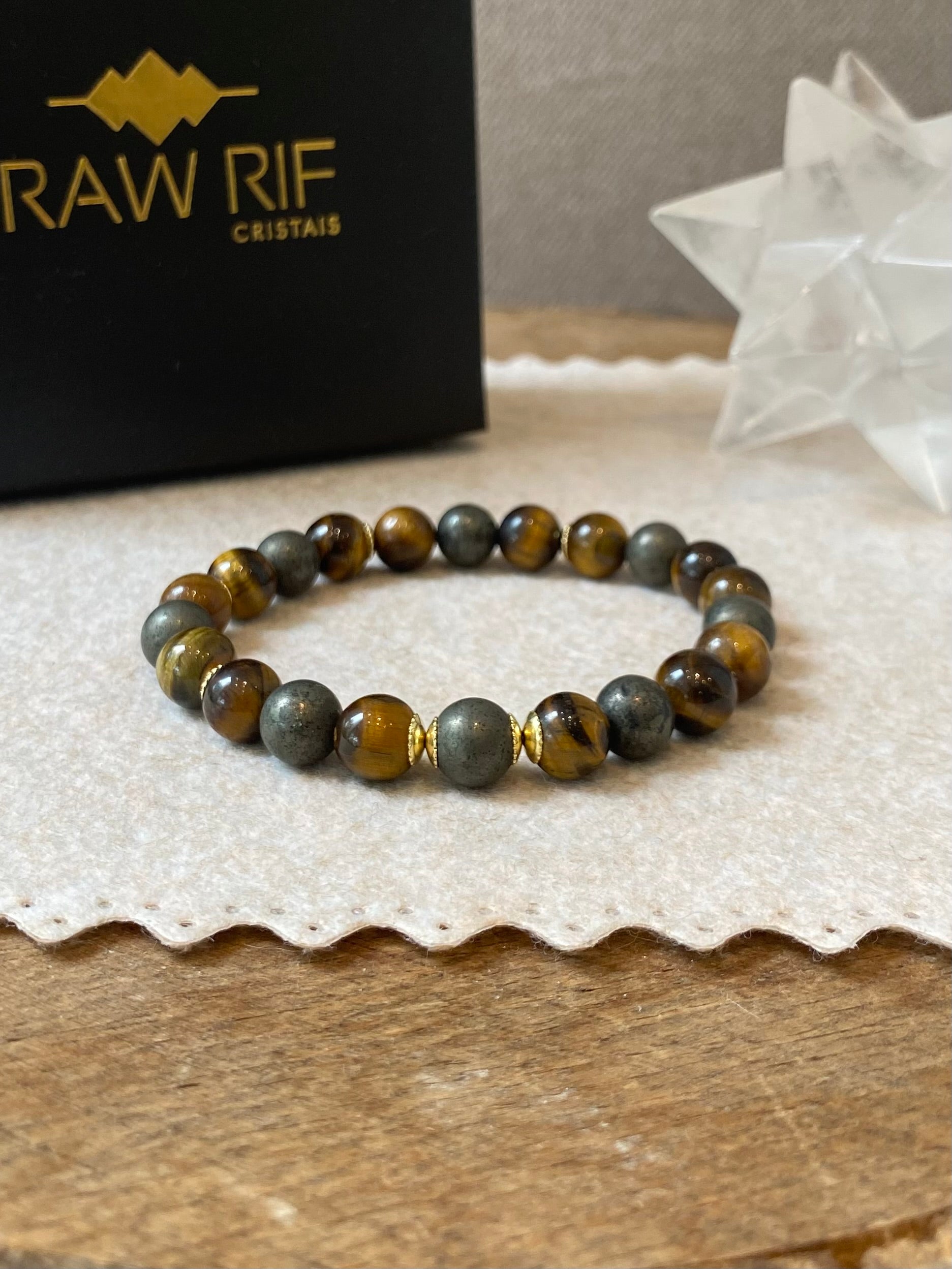 Joia CR feita a mão com cristais de Olho de Tigre e Pirita.