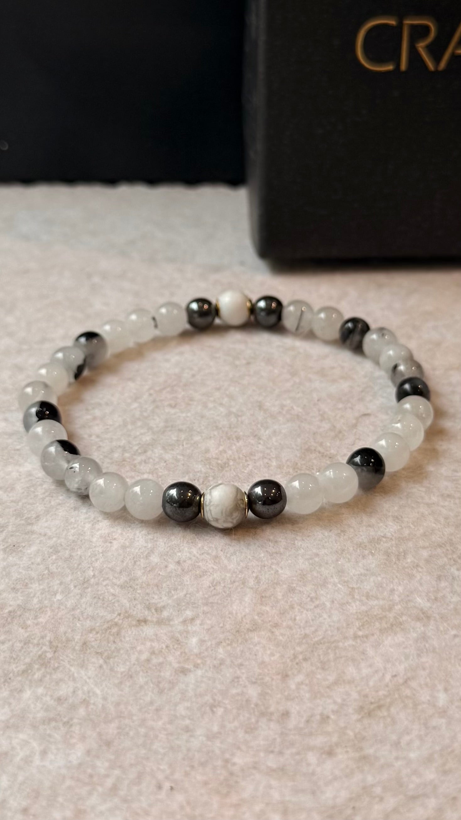 Joia Craw Rif, feita à mão, com cristais Quartzo Turmalinado, Hematita e Howlita.