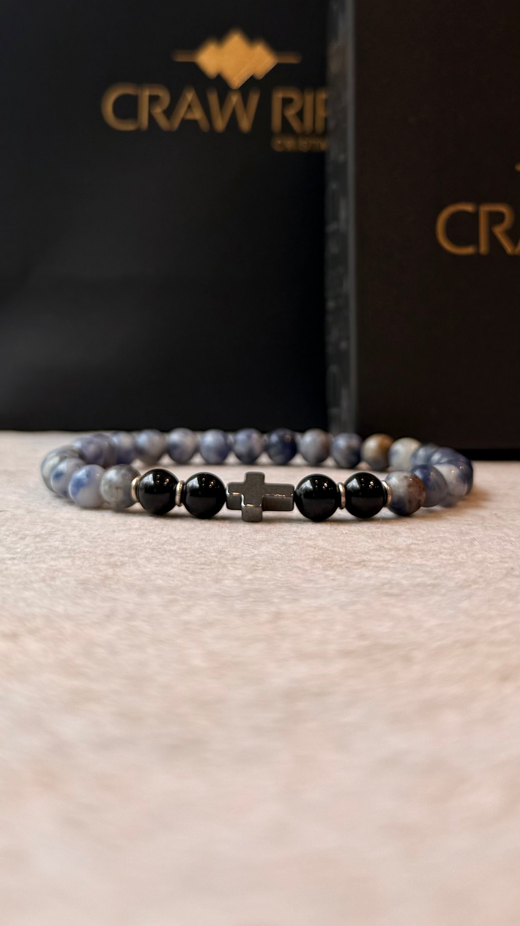 Feita à mão com cristais de Sodalita, Turmalina Negra e a Cruz lapidada de Pedra Hematita.