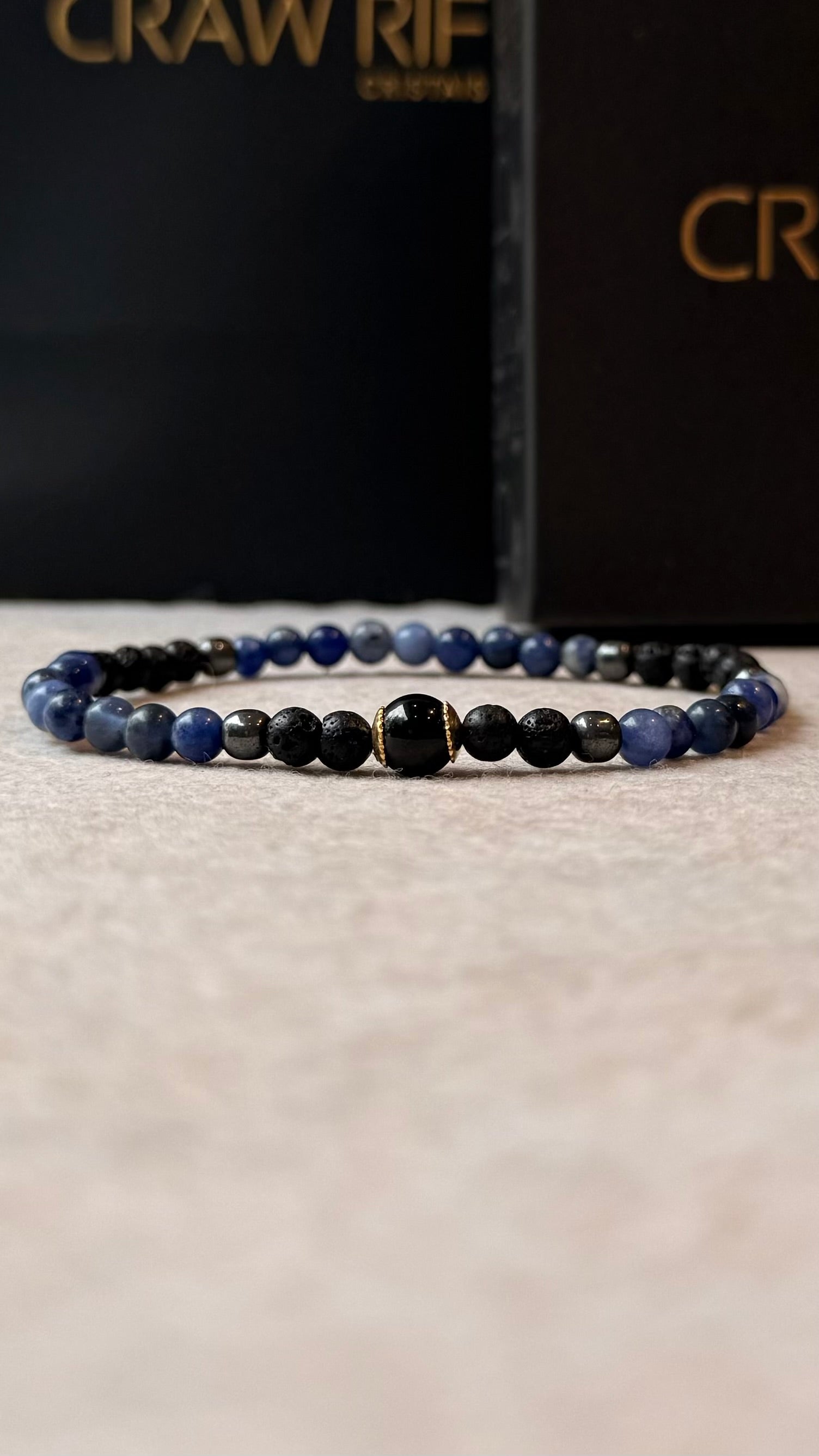 Joia Craw Rif Minimalista, feita à mão, com cristais de Sodalita, Hematita, Lava Vulcânica e Turmalina Negra.